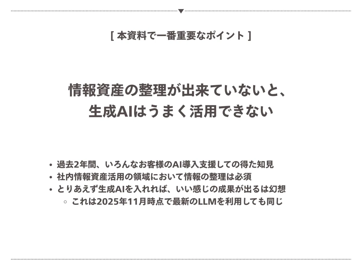 「とりあえず社内ストレージと最新の生成AIを接続してRAG構築すれば、いい感じになるんでしょ」と軽く考えていた2年前の私に読ませたい内容となっております。