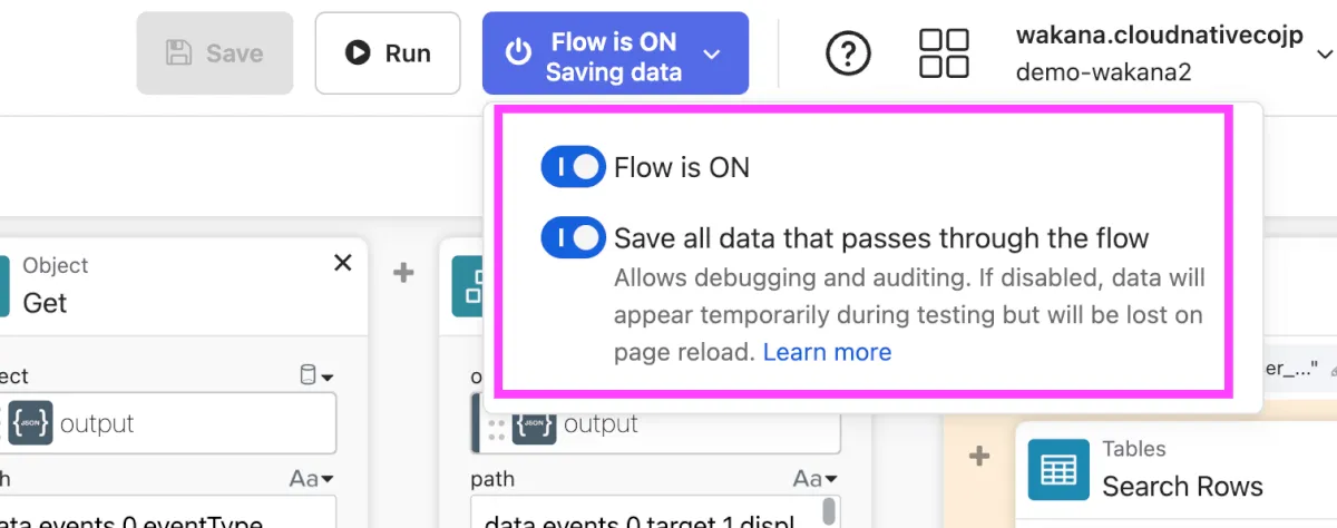 - 「Flow is ON」及び「Save all data that passes through the flow」が両方とも有効になっている必要があります。