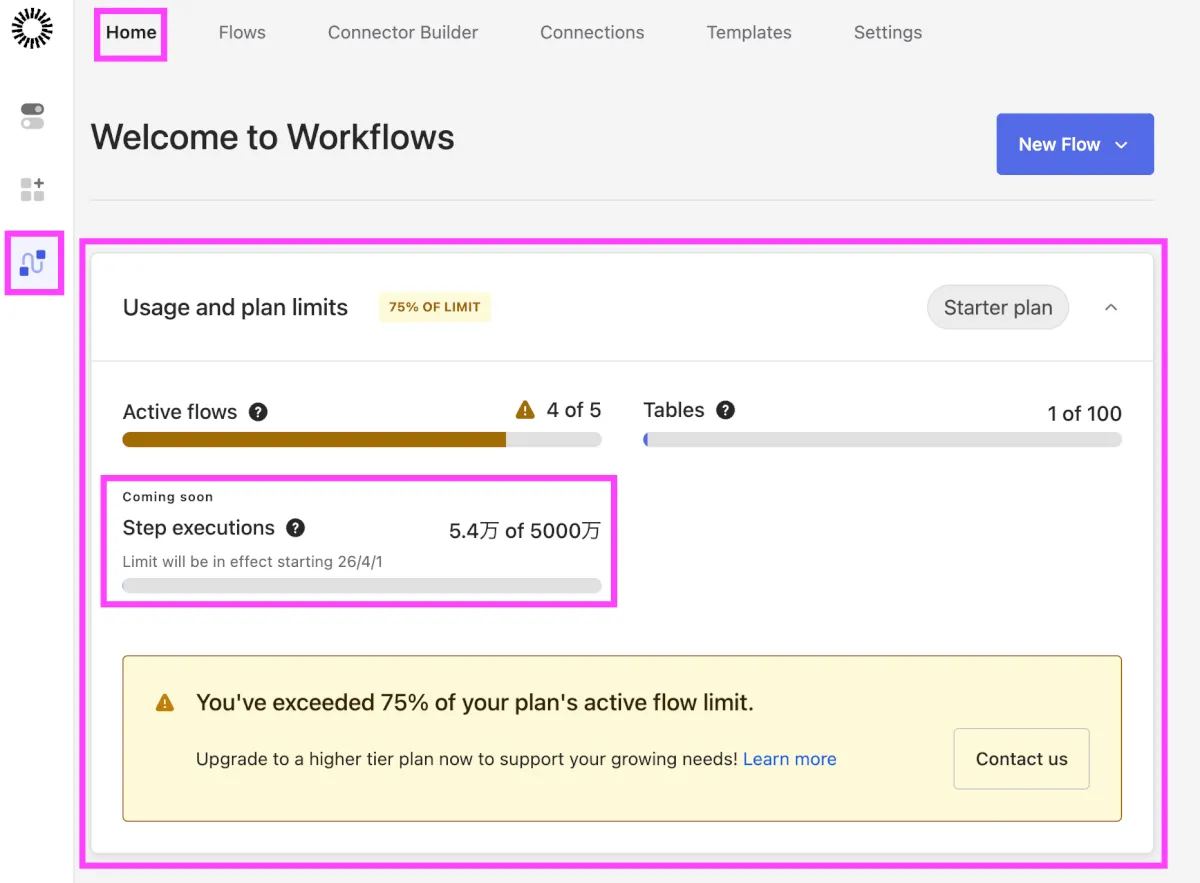 - 対応策:Workflowsホームの「Usage」パネルでステップ数を確認し、必要に応じてフローの見直しや有料プランへの移行を検討する。