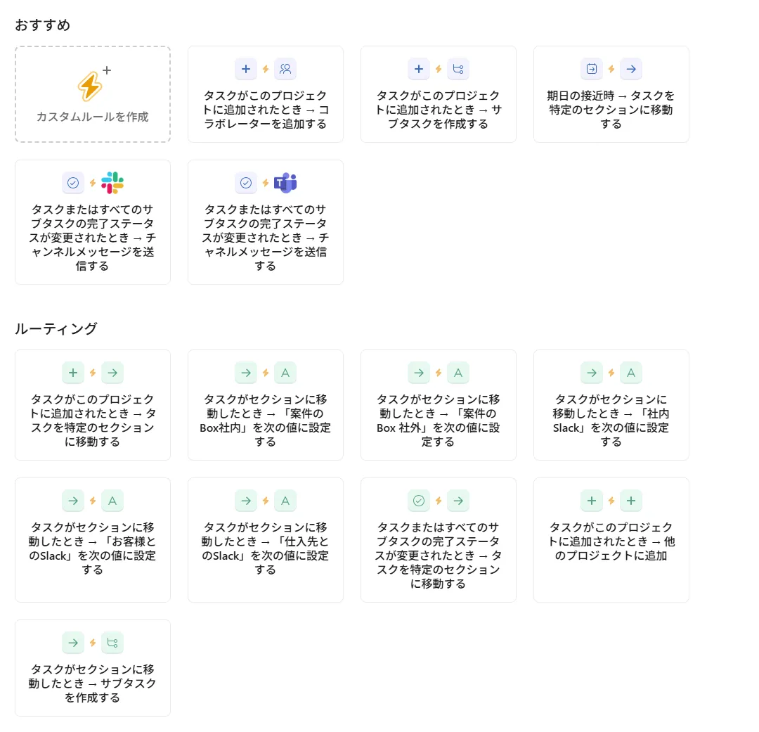 ④Asanaには数多くのテンプレートが用意されているので、その中からお好きなルールを選び、タイミングや条件(例:タスク完了時、担当者変更時など)を設定します。