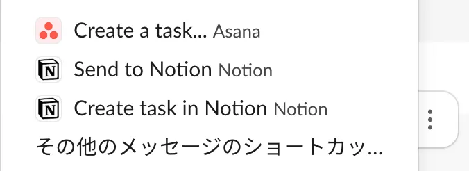 ③これで、Slackのメッセージの「…(三点リーダー)」メニューの中に、「Asanaタスクを作成」という項目が追加され、Asanaへ起票ができるようになります。