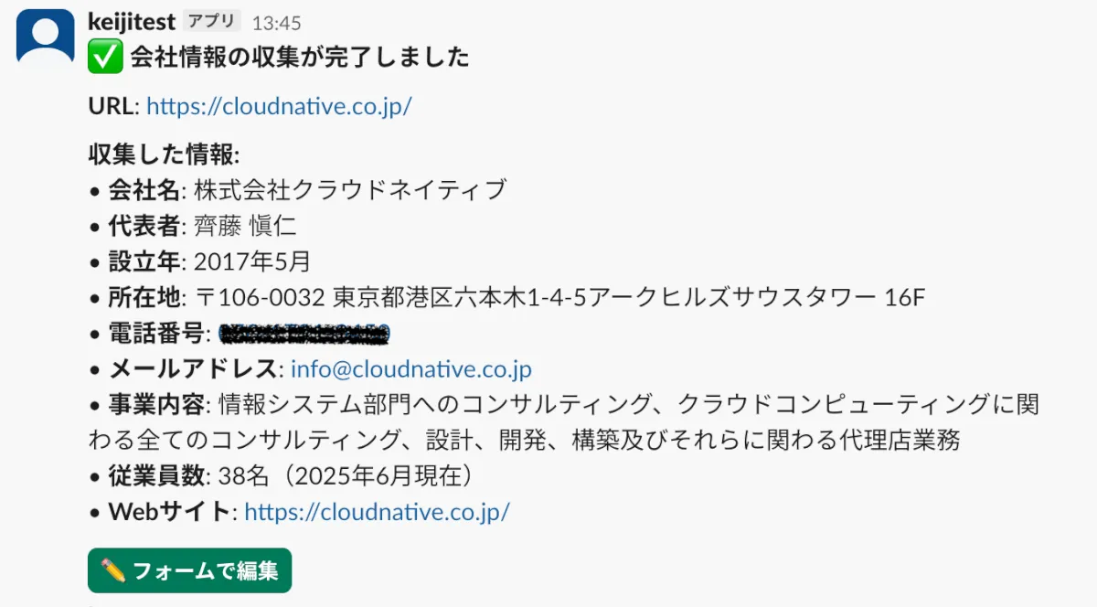 会社情報ページ(https://cloudnative.co.jp/company)に移動後、エージェントは以下の情報を発見・抽出しました。