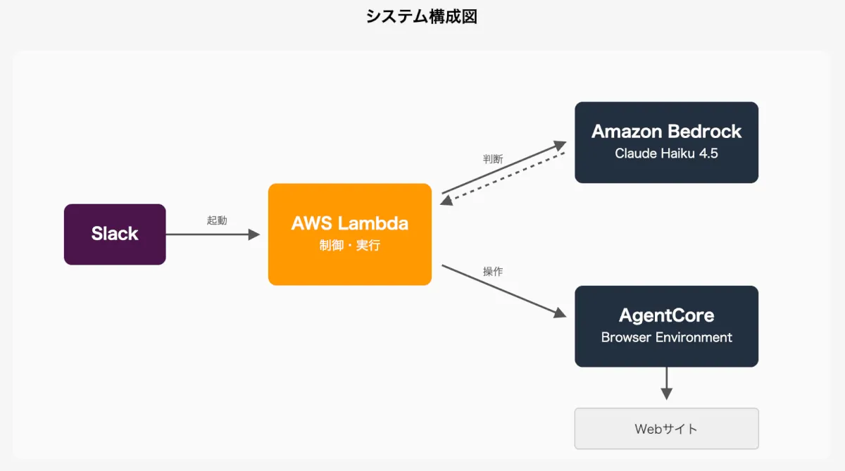 bedrock-agentcore) のBrowserClientを使用してブラウザセッションを管理します。 - Playwright を介してブラウザに接続し、実際のページ遷移やクリック操作を実行します。