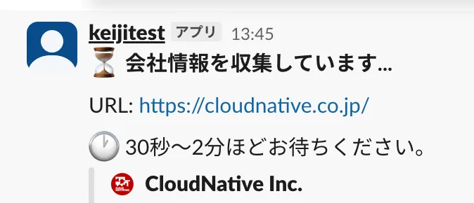 /company-info [URL]コマンドを実行 - Lambda 関数の呼び出し: Slack からのリクエストを受けて Lambda 関数が起動