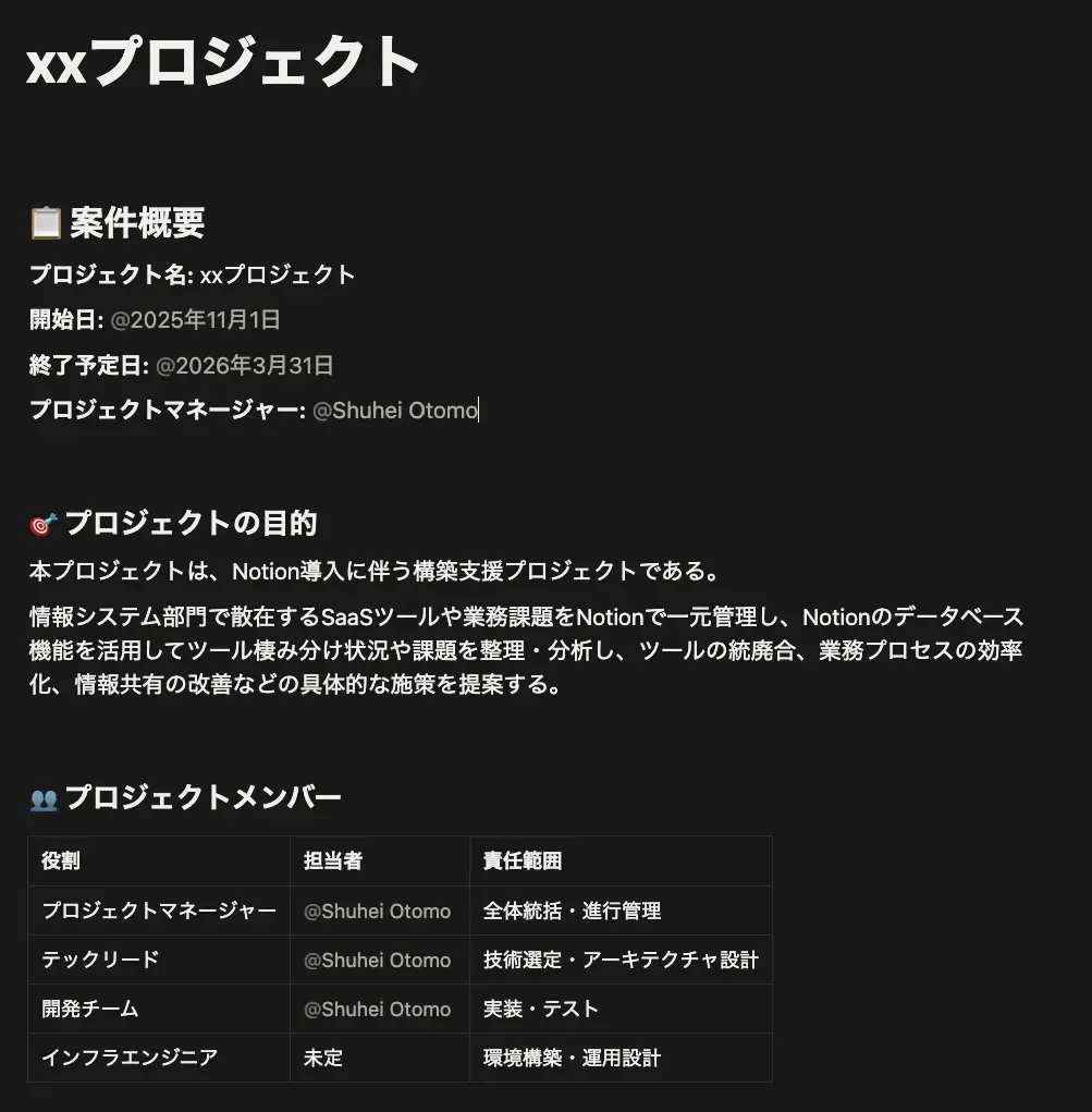 まずはメモ帳やExcelに残していたテキストを、Notionに直接記載しています。 Notionのページはブロック形式で作れるため、視認性、可読性がとても優れています。 見出しを作り項目ごとに区切る、表を作り整理する、担当者にメンションしたり思ったことは大体できちゃいます。
