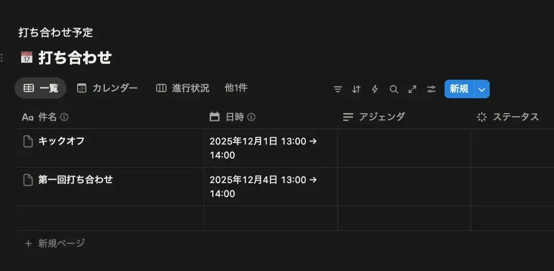 最後にNotionカレンダーを利用して、プロジェクトに関連する予定の管理をしていきましょう。 打ち合わせ予定を入れるデータベースを作り、例として以下のように予定を入力します。