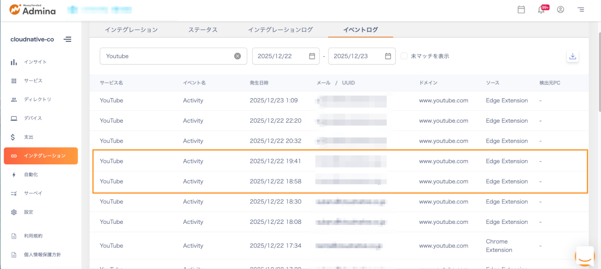 何回アクセスしているの?などの情報をもっと詳しく確認したい場合は、上に表示されているタブのイベントログからユーザー名やサービスで検索することで表示ができます。ちなみにイベントログでの出力結果を見ると、YouTubeやX(旧Twitter)などのアクセスについても検出できていました。