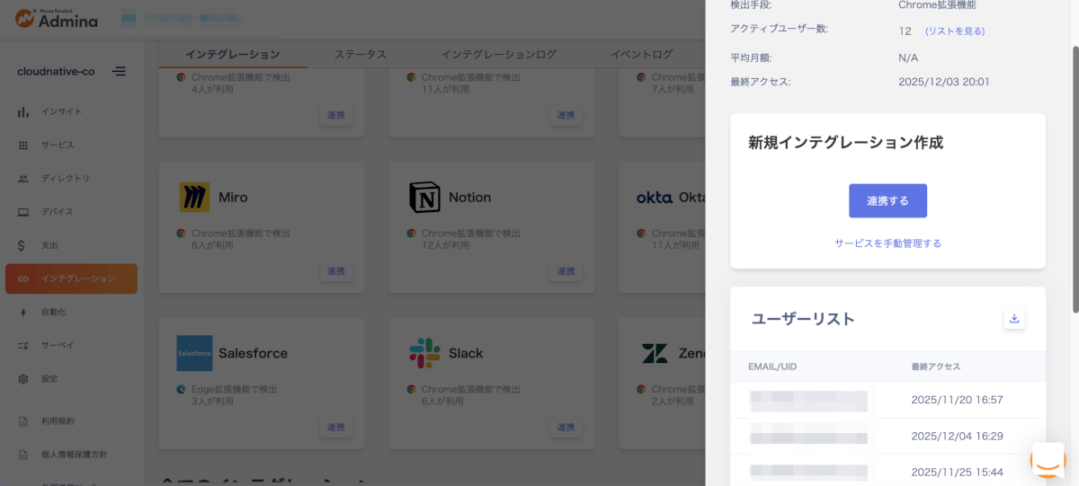 もちろん、「誰がそのSaaSを使っているの?」「最後にいつ使ったの?」「どこから検出されたの?」などの情報もインテグレーション内のアプリケーションを押せばユーザーリストとしてすぐに可視化できます。