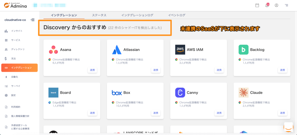 Adminaでは、このシャドーITを検出した場合には、管理画面のインテグレーションを開くと大きく「Discoveryからのおすすめ(◯件のシャドーITを検出しました)」として表示されます。