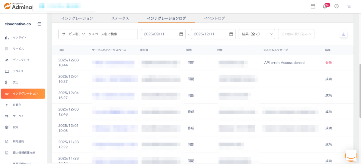 さらに、「未連携のSaaSをAdminaに繋ぎ込んだ日時はいつか」、「誰がやったのか」などもインテグレーションログを見ると確認できます。本当は許可されていないSaaSをAdminaで検出されないように意図的に連携した、というような事態が発生した時にも、このログをチェックすることで原因究明のヒントを掴める可能性があります。