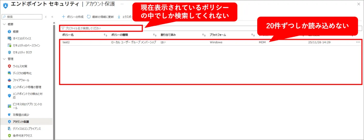 アカウント保護ポリシーの画面内にある検索機能は、現在表示されているポリシー内にしか適用されません。また、アカウント保護ポリシーは20件ずつ表示され、それ以上読み込むにはページをスクロールして [さらに表示] ボタンをクリックする必要があります。