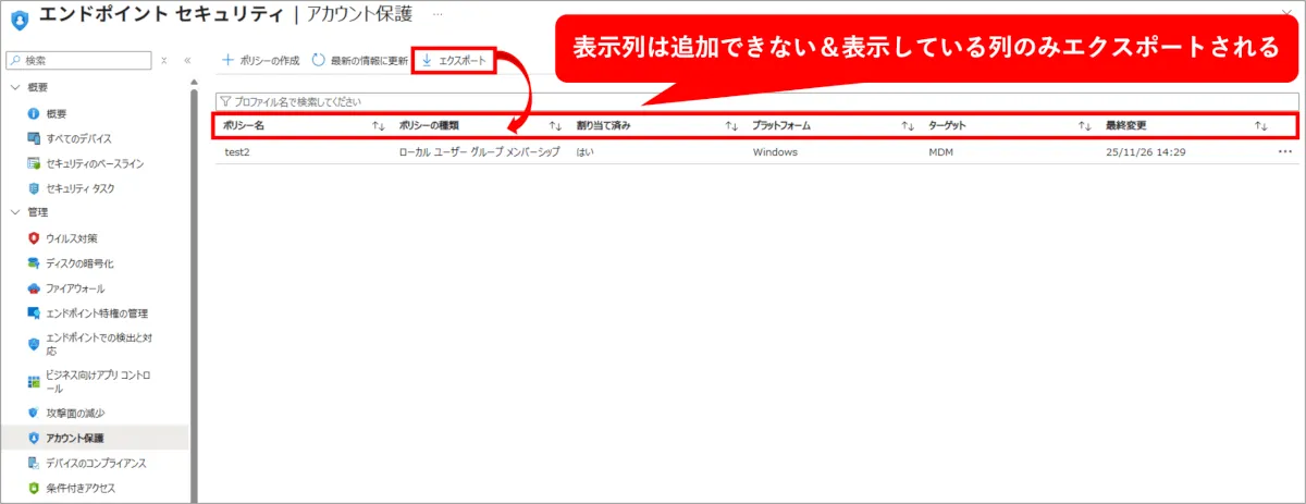 ただし、アカウント保護ポリシー内には列を追加する機能はないため、このように誰も使わないようなポリシーセットがエクスポートされることとなるのかなと思いました。