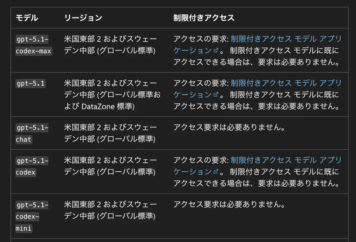 ※アクセス要求が必要なものがあり、Microsoftに申請中ですが間に合わなかったので今回はgpt-5.1-chatのみを触れていきます。※