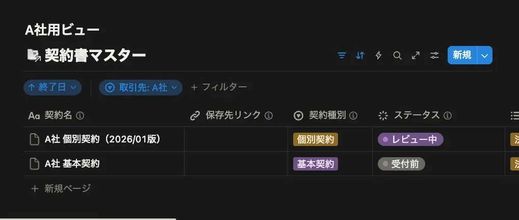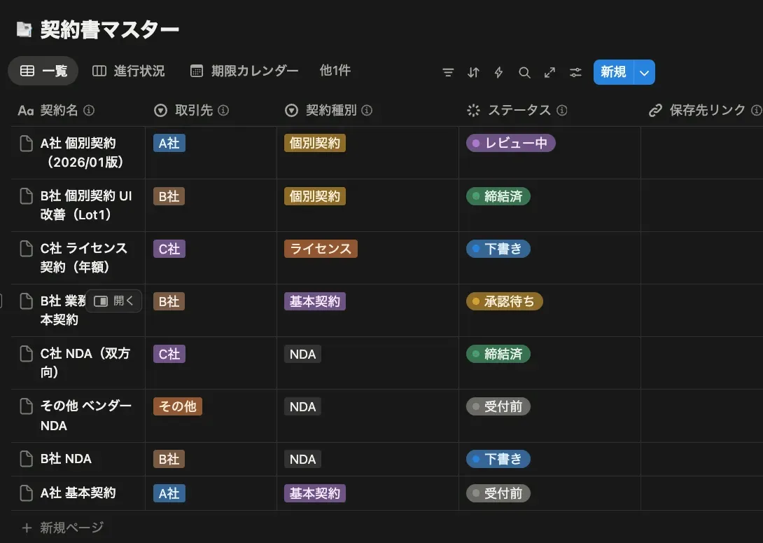 - 法務部のページ:全ての契約書を一覧表示する