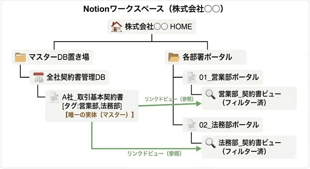 マスターDBに全契約書の情報(保存場所含む)を載せ、各部署のページでは、見たい情報だけ見れるようにセットします。マスターのデータは常に一つのため、バージョン管理や編集はマスター以外触る必要ありません。また、部署以外にA社の情報だけみたいなどその時の要望に応じて柔軟に対応可能です。