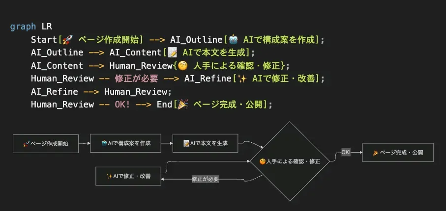 他にも私が便利と感じたのはMermaid記法ですね。AIに作りたいものを指示してそのまま表示してもらえるのも楽です。