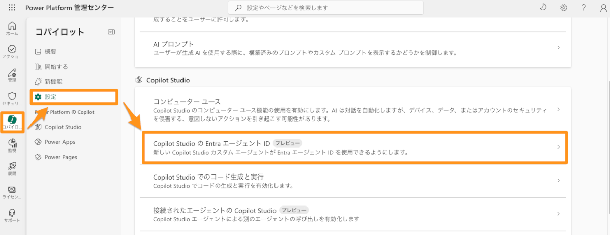 ただし、Copilot Studioのエージェントに自動でAgent IDを払い出すには、Power Platform 管理センターにて、Agent ID自動作成の有効化が必要になります。