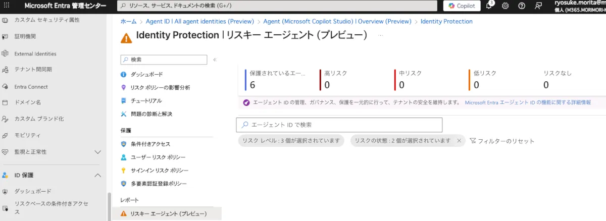 また、Identity ProtectionのダッシュボードでもAgent IDに関するリスクの確認が可能です。