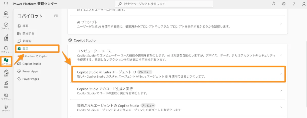 ただし、Copilot Studioのエージェントに自動でAgent IDを払い出すには、Power Platform 管理センターにて、Agent ID自動作成の有効化が必要になります。