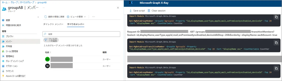 上記画像からは、GET /groups/<group id>/transitiveMembersというエンドポイントを叩いていることが分かります。また、今回利用したツールではそれに対応するGraph PowerShellコマンドも表示してくれるので大変便利です。