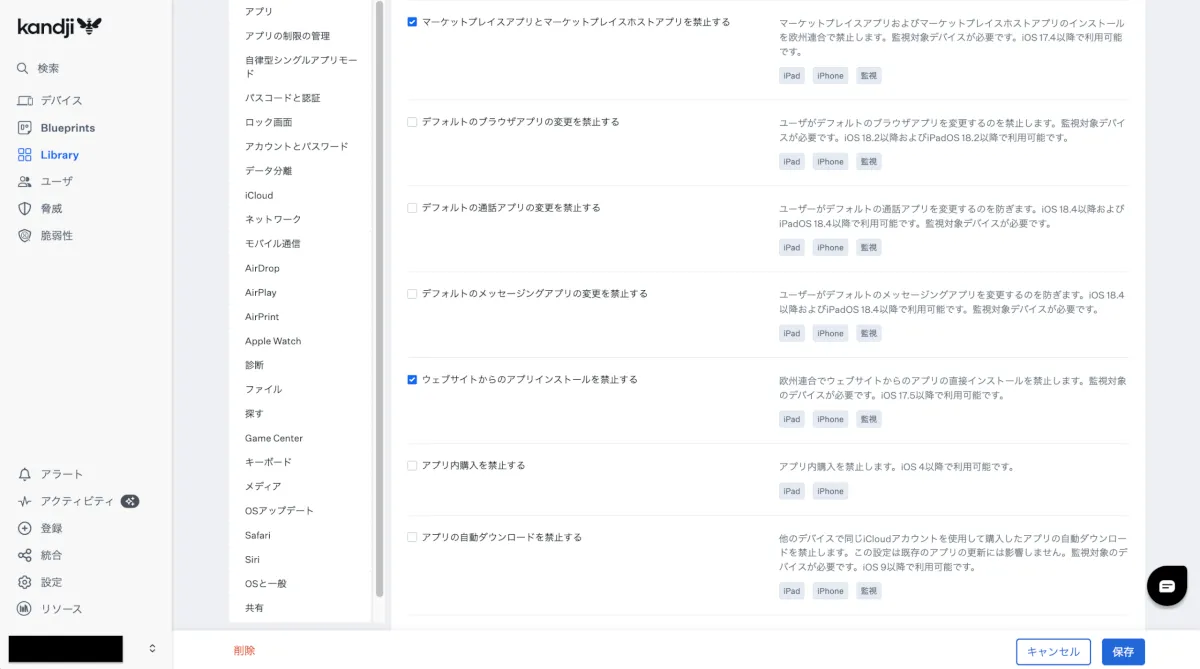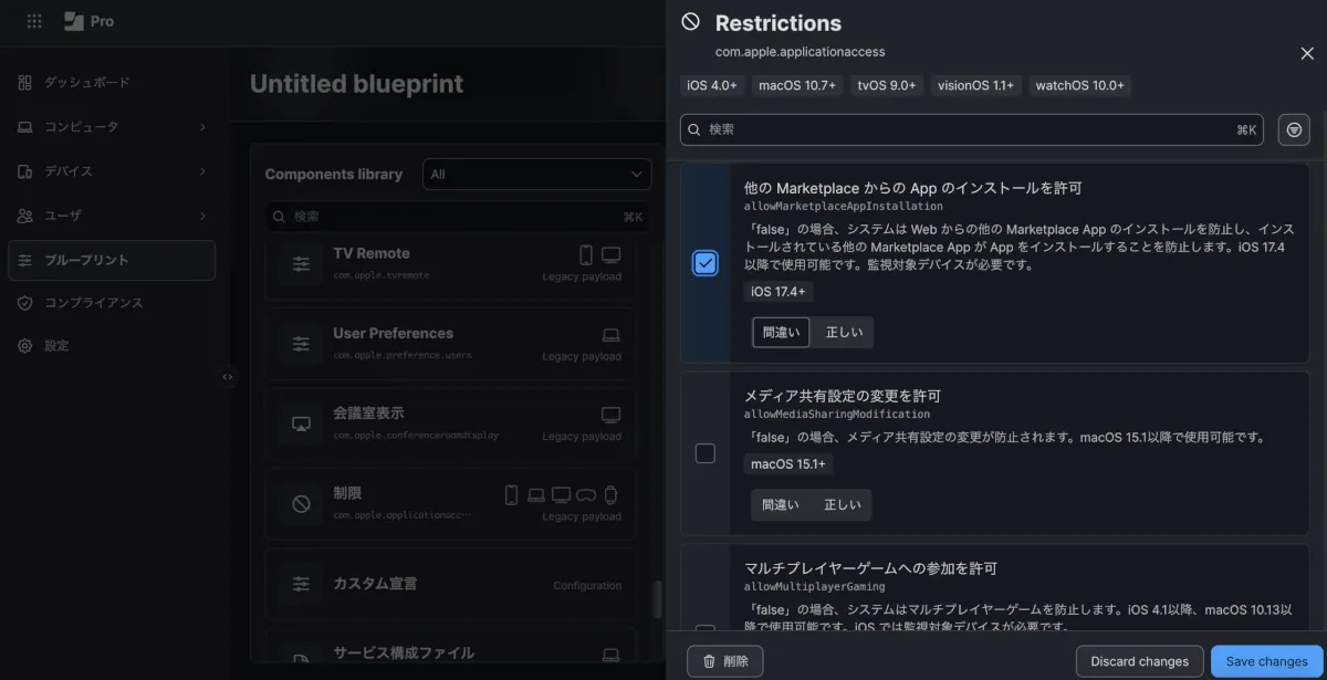 - Jamf Pro管理コンソール > ブループリント > 右上”+ ブループリントを作成” > 「制限」カテゴリ内