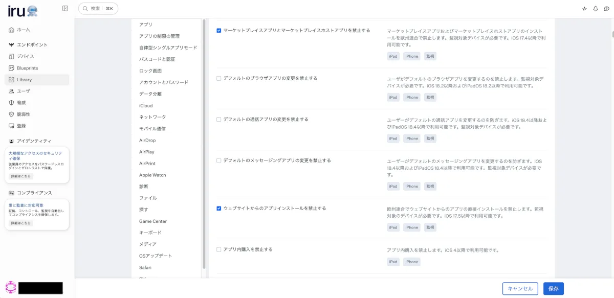 - Iru管理コンソール > Library > 右上”+ Library Itemを追加” > 「制限」を選択し、右下”追加と構成” > 「アプリ」カテゴリ内