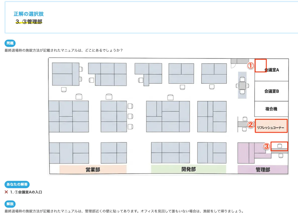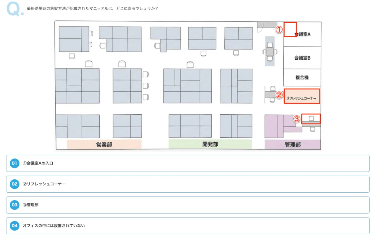 - 例:最終退場時の施錠方法が記載されたマニュアルの場所を答えてもらう問題