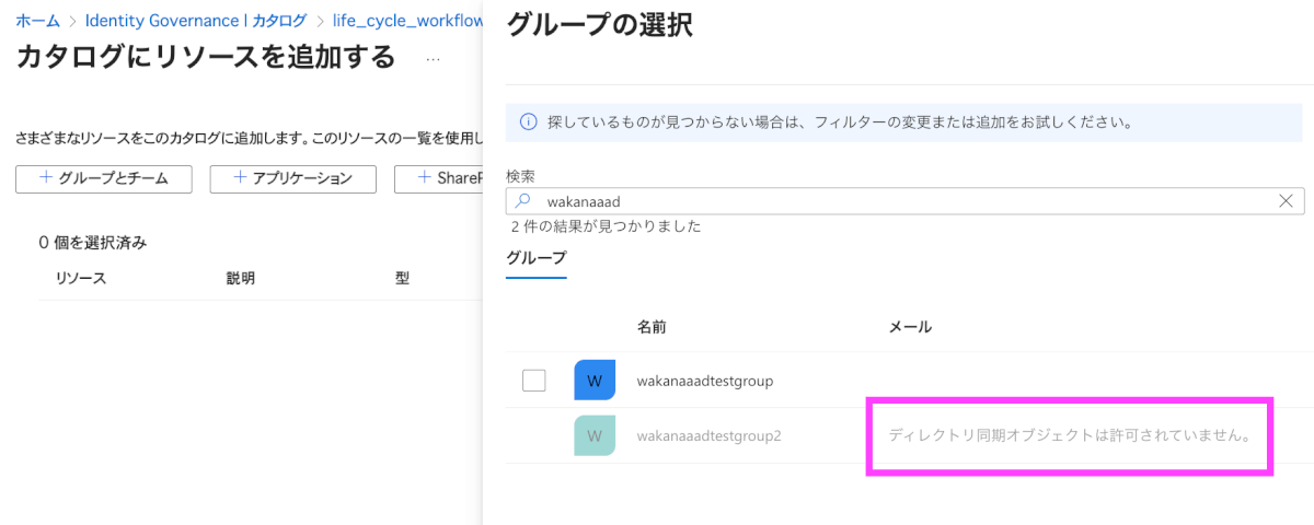 - そもそも、Entra ID Governanceのカタログにリソースを追加しようとしても、「ディレクトリ同期オブジェクトは許可されていません」と表示され、選択すらできませんでした。