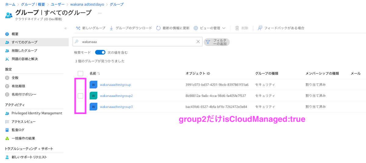 例えば、真ん中の「Group2」だけをクラウド管理に切り替えた場合、Entra ID上では以下のように見えます。