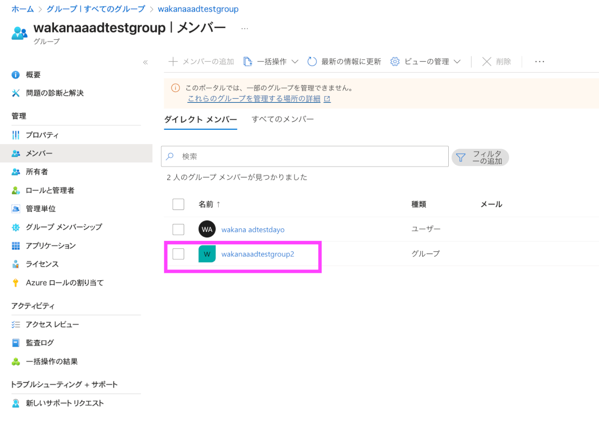 なお、管理権限がバラバラになっても、親子関係(メンバーシップ)はそのまま維持されます。以下のように、親グループ(AD管理)の中に、クラウド管理になった子グループ(Group2)がメンバーとして正しく残っていることが確認できました。