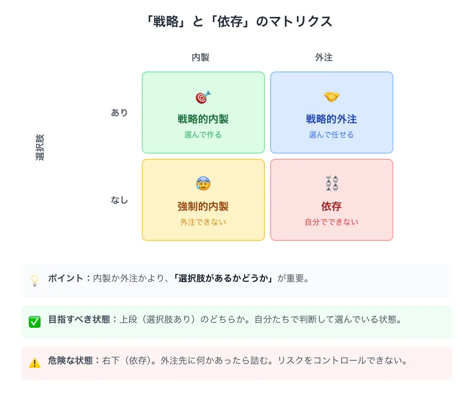 - 選択肢を持った上で外注を選ぶのは戦略、選択肢なく外注するのは依存