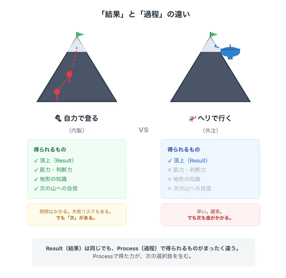 すべての山を自分で登る必要はありません。本業に関係ない山まで自力で登る意味があるのか?という問いは正当だと思います。