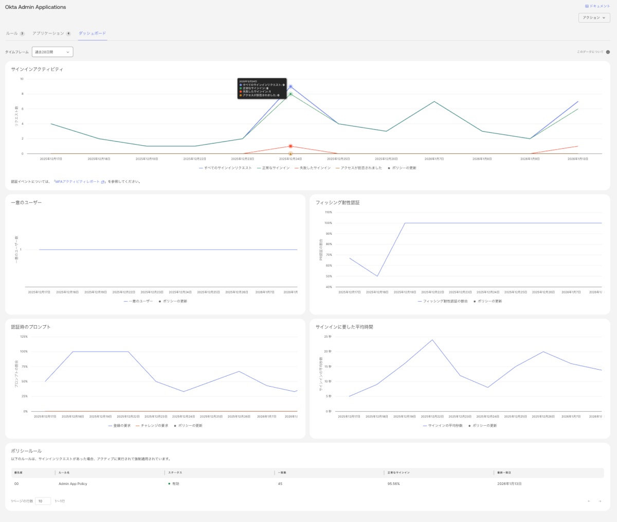 これまで、認証ポリシーを作った後、「ユーザー体験は良くなったのか?」「セキュリティ強度は上がったのか?」を外部BIツールなしに測るのは難しい作業でした。この新機能は、認証ポリシーの状態を可視化してくれます。