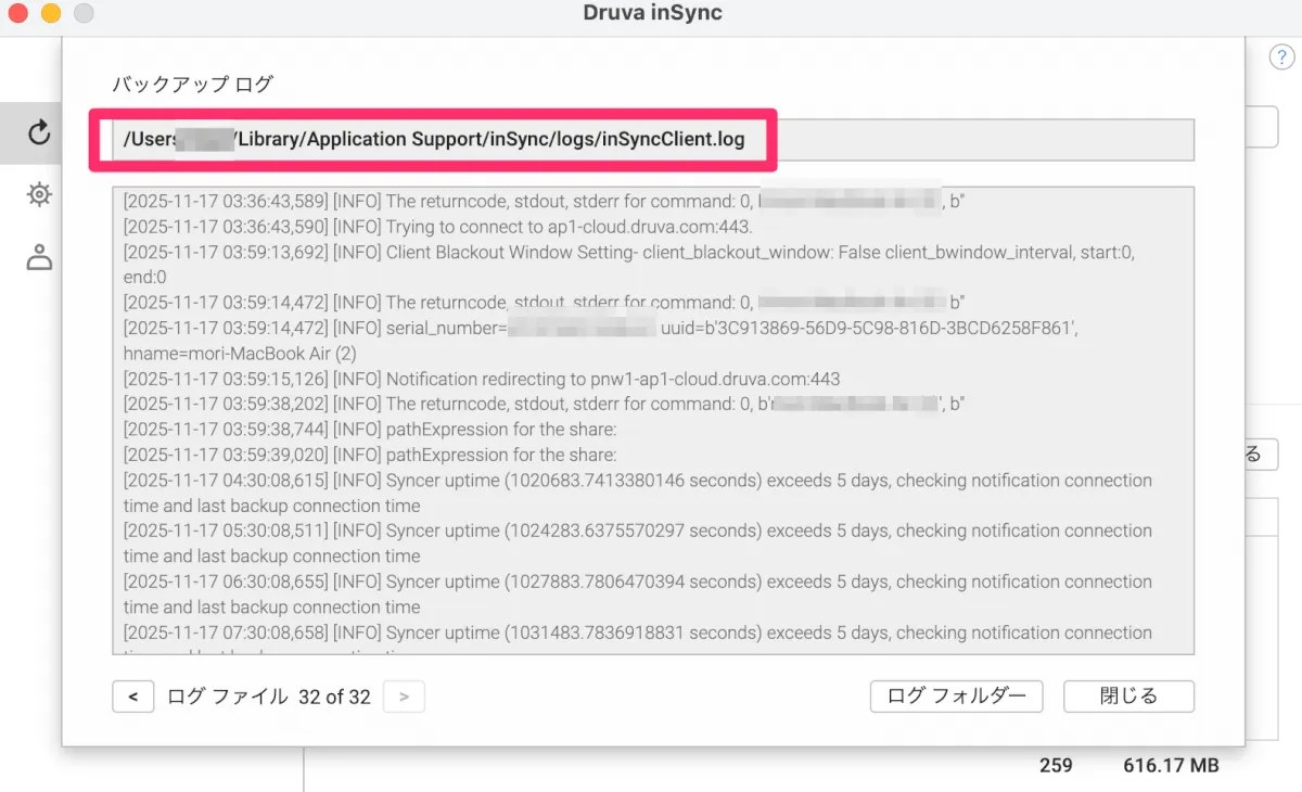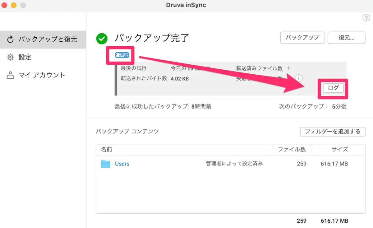 クライアント端末のinSyncアプリを開き「バックアップと復元」の画面に小さく表示されている「詳細」の文字をクリックすると直近のアクティビティが表示されると共に、画面右下に「ログ」のボタンが表示されるので、こちらを押してログを見ていきます。