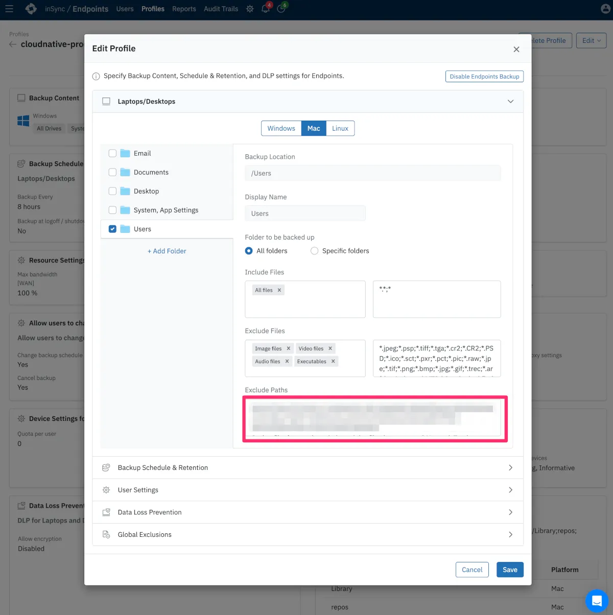 作成した新プロファイルの「Exclude Paths」にフォルダパスを追加します。今回は”特定のフォルダを対象として”バックアップ除外設定を施しましたが、画像や動画など特定のファイル(拡張子)を除外したい!という場合は「Exclude Files」に対象ファイルの拡張子を追加すると、除外判定されます。