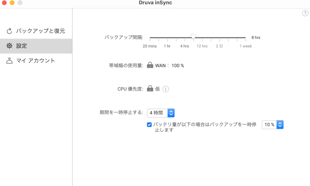 - 「バッテリ量が以下の場合はバックアップを一時停止します:10%」