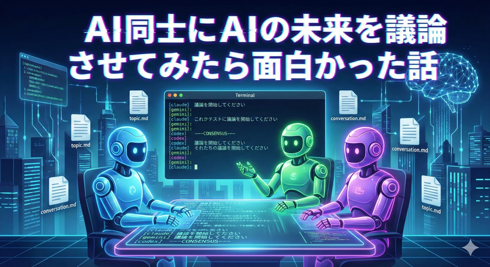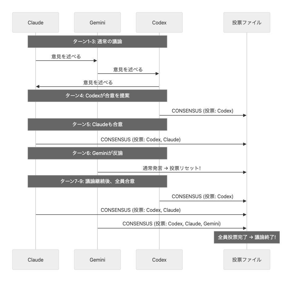 - 合意形成: Geminiが合意案を提示し、Codex・Claudeがそれぞれ補足を加えながら賛同。最終的に三者とも「—CONSENSUS—」を表明し、「残る論点は実装詳細であり根本的な方向性の相違ではない」として議論が収束した