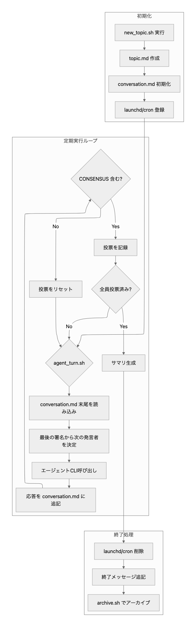 人間が提示したお題に対して、複数のAIエージェントがファイルベースで非同期に議論を行い、全員が合意に達した時点で自動終了するシステムです。