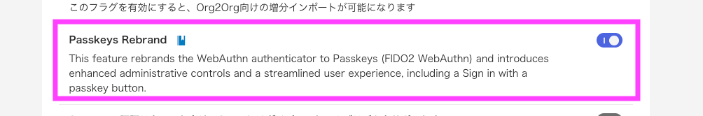Settings(設定) > Features(機能) から、「Passkeys Rebrand」を有効にします。