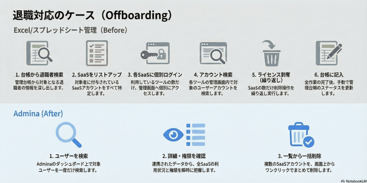 Excel/スプレッドシート管理では、対象者がどのSaaSを持っているかSaaS別にシートを見にいき、各管理画面から再度ユーザーを探し、削除するというステップが必要です。