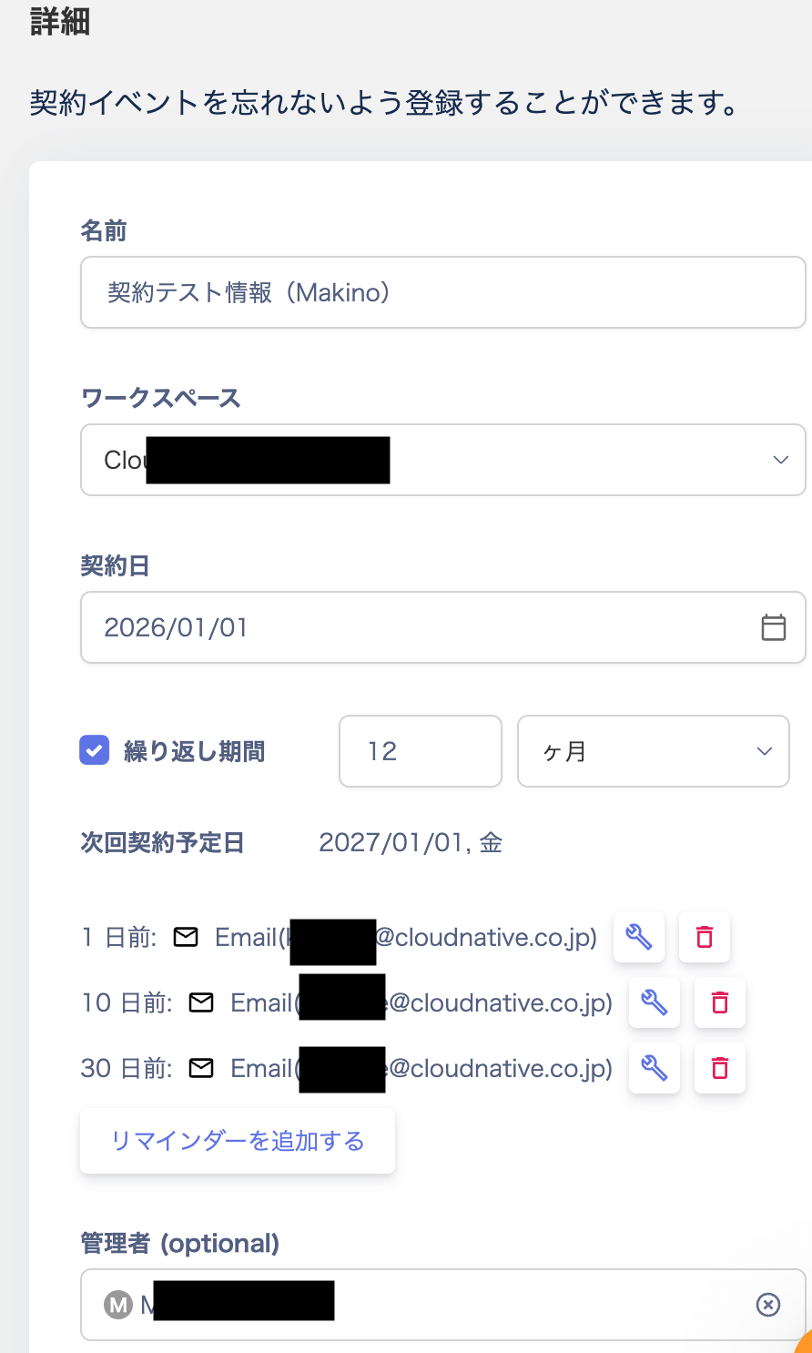なお、リマインド通知は契約日を設定したら自動でセットされるわけではなく、通知設定を行う必要があります。その反面、手動設定ゆえの柔軟性もあり、契約ごとに異なる通知タイミングや担当者を細かく調整できる点はメリットと言えます。