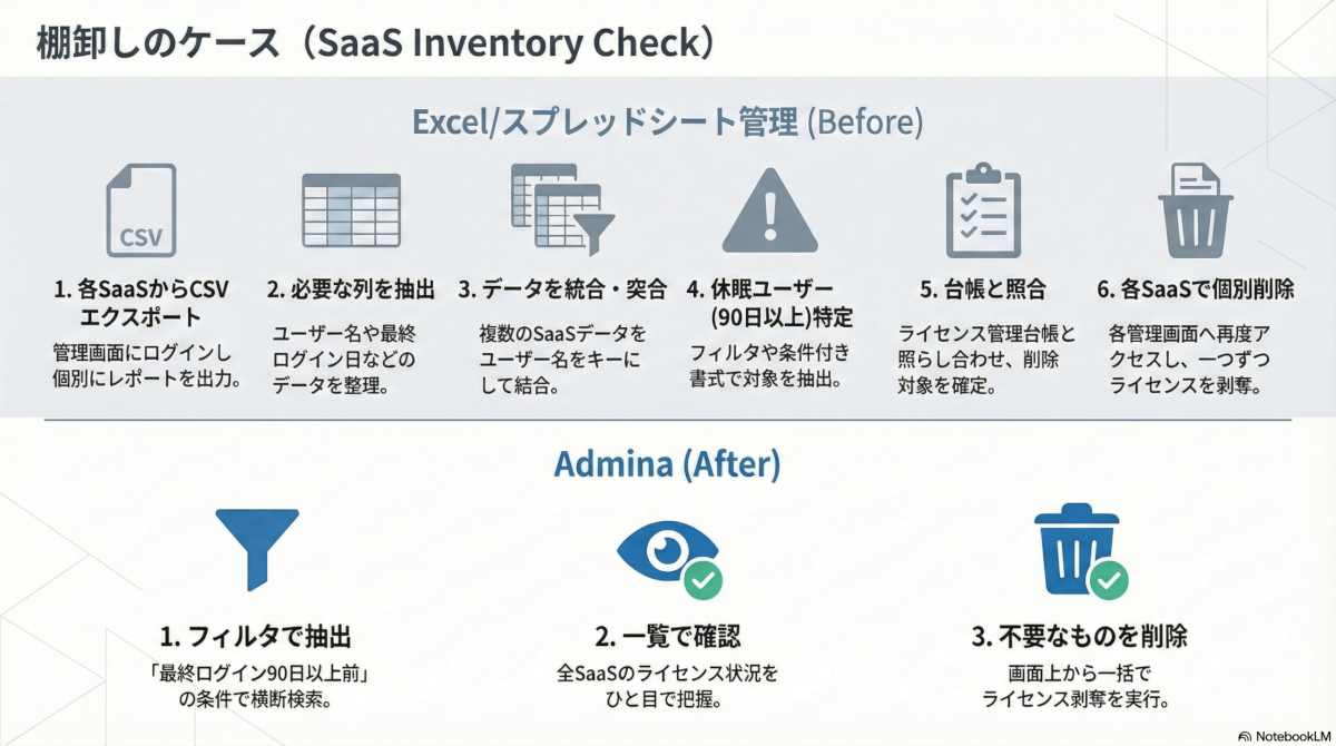 Excel/スプレッドシート管理では、各SaaSからCSVを集めて列を整形し、複数データを突合したうえで、最後は各SaaSの管理画面で個別にライセンスの剥奪を行う必要があります。