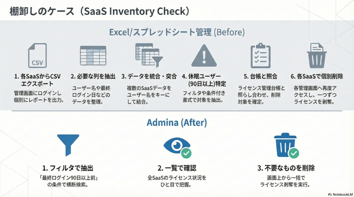 Excel/スプレッドシート管理では、各SaaSからCSVを集めて列を整形し、複数データを突合したうえで、最後は各SaaSの管理画面で個別にライセンスの剥奪を行う必要があります。
