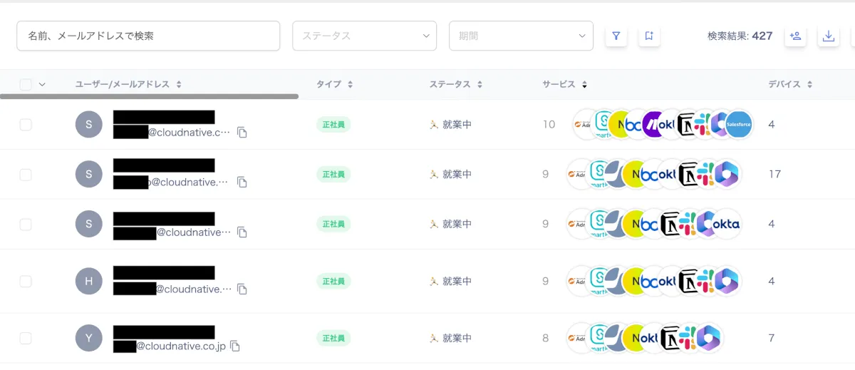 ユーザーの一覧画面では、ユーザーに紐づく情報を起点に、ライセンス状況を横断的に把握できます。下記のような特徴があります。