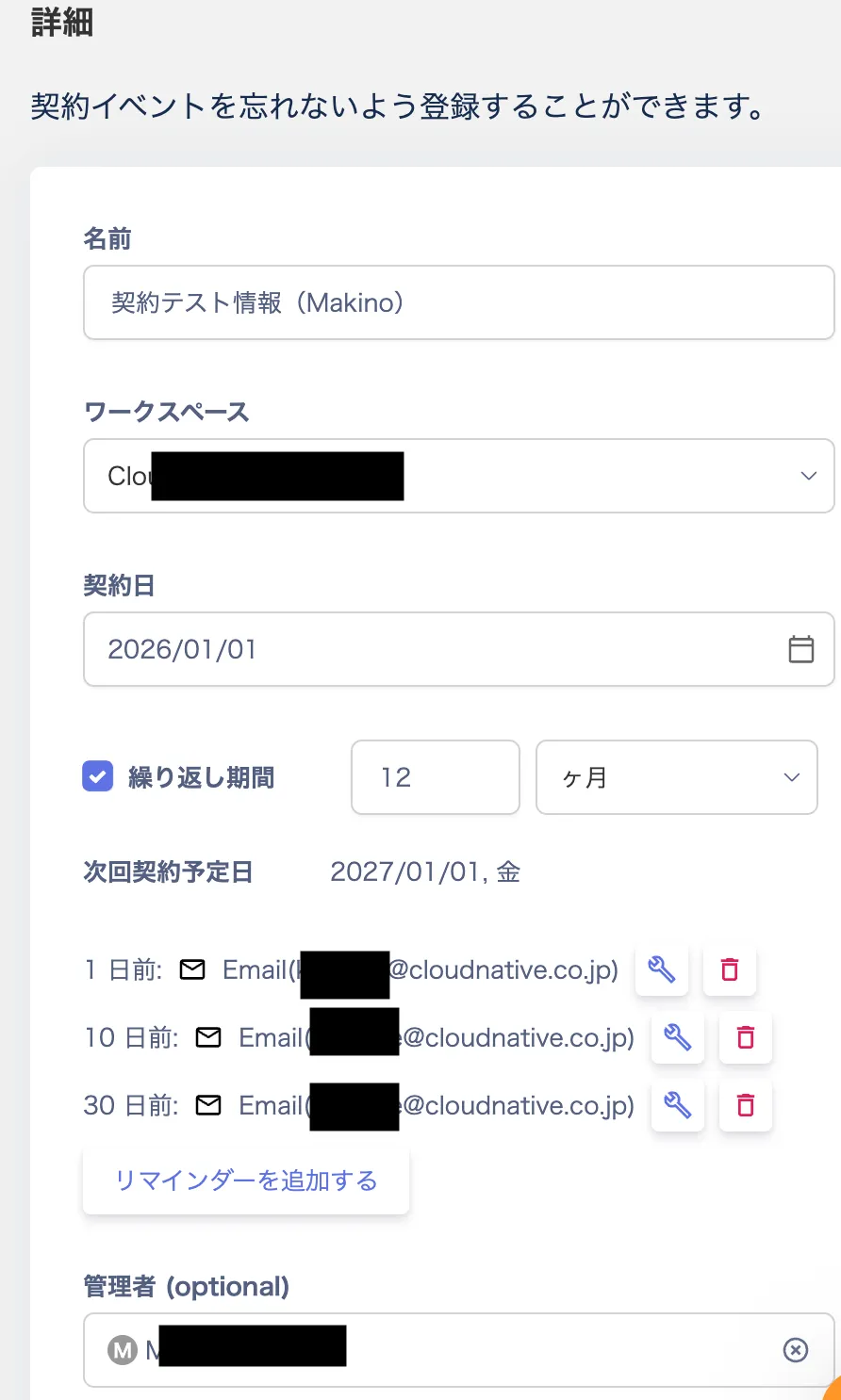 また、契約情報と通知設定を組み合わせることで、契約更新の漏れを防止しやすい点もメリットでした。
