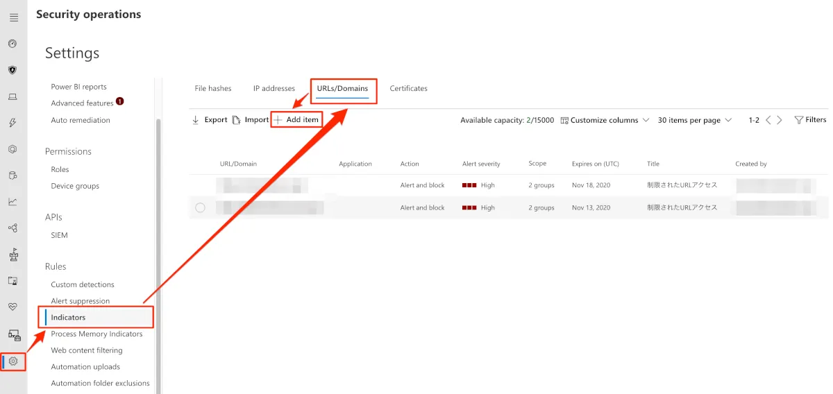 - Microsoft Defender Security Centerへアクセスし、 Settings > Rules > Indicator > URLs/Domains に移動し、”Add items”を選択します。