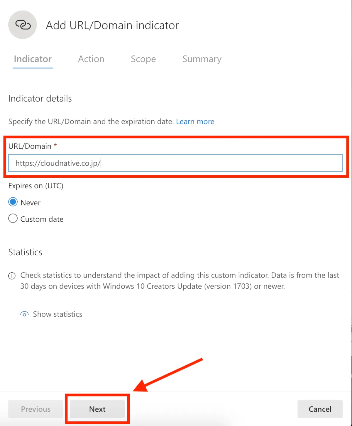 - “URL/Domain”の項目に、指定したいURLを入力し、”Next”を選択します。