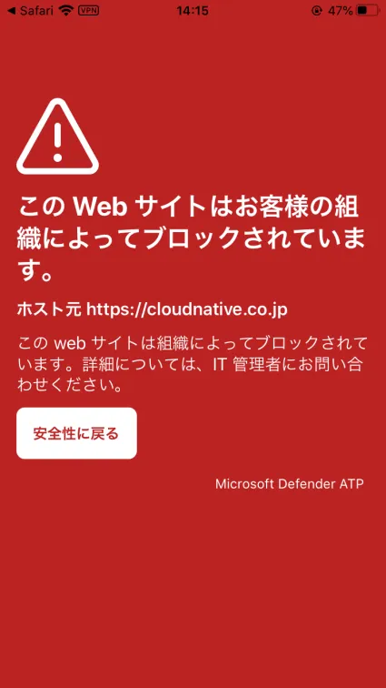 以上で、設定は完了です。 しばらくした後に、iPhoneから指定したURLへアクセスするとこのような画面になり、アクセスがブロックされていることがわかります。