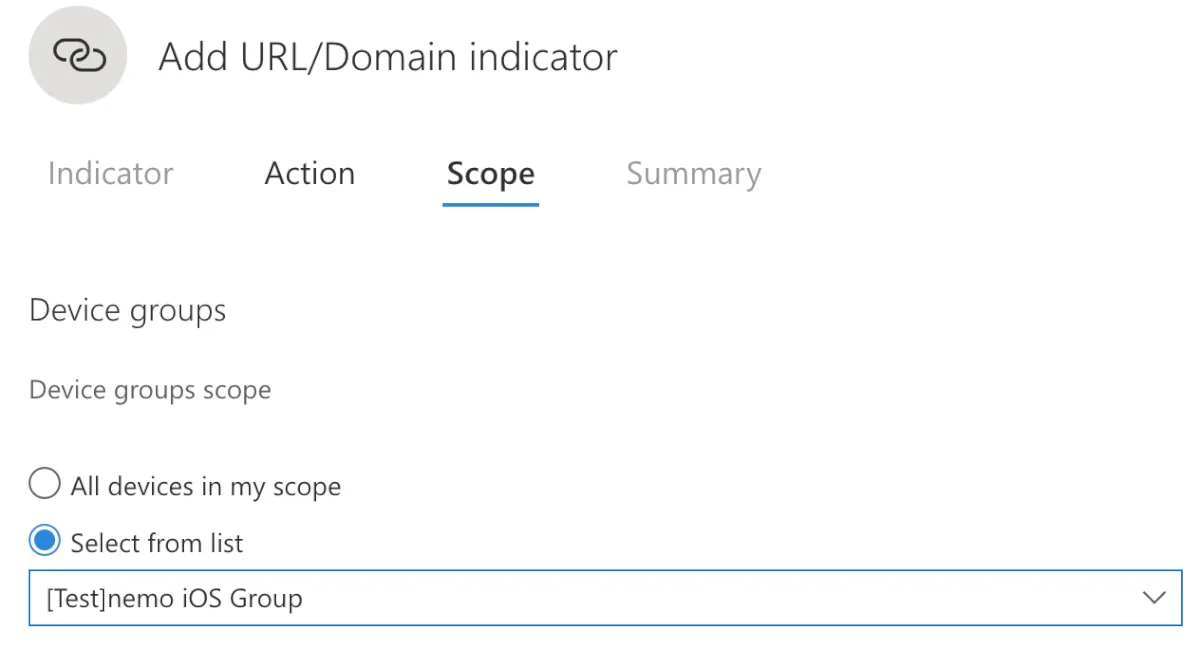 - Scopeタブで任意の”Device groups”を設定します。今回はテスト用に作成したグループを割り当てました。デバイスグループの作成はこちらを参考に。