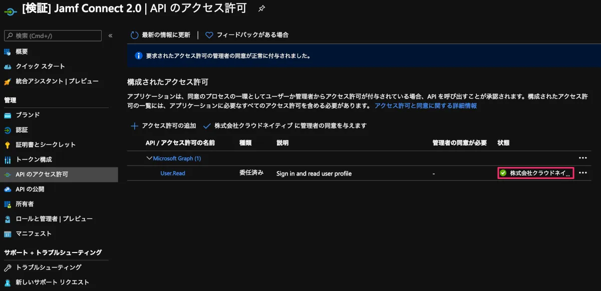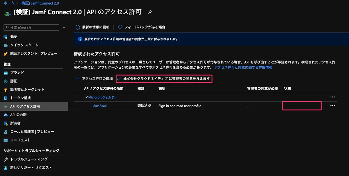 APIのアクセス許可についてですが、標準では「管理者の同意」が行われていないため、手動で「管理者の同意」を与え、状態欄にチェックが入るようにします。